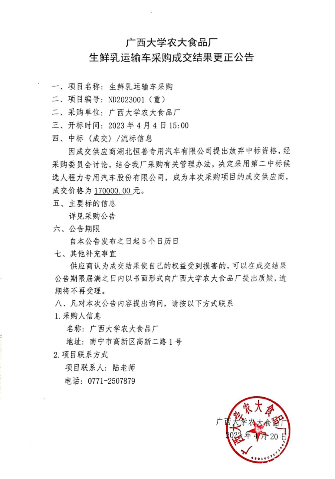上一条:广西西大朴诚后勤产业服务有限公司2023年春季学期食堂大宗物资采购招标中标结果公示 下一条:广西西大朴诚后勤产业服务有限公司博萃楼餐厅一卡通项目单一来源采购公示