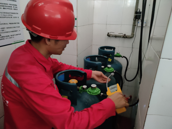 本次检查,重点是查验餐厅所使用的液化气瓶罐是否有超标使用、钢瓶是否在定期检验有效内、燃气管道是否有老化破损、液化气罐摆放位置是否符合安全要求、燃气报警装置是否正常工作等现象。针对排查中发现的软管老化、管道接头松动、钢瓶放置点与热源过近等问题,要求餐厅立即联系燃气公司,即时整改,坚决杜绝设备“带病”工作。