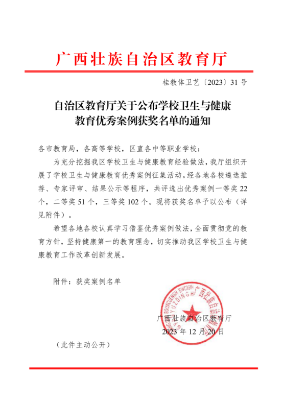 日前,自治区教育厅公布了学校卫生与健康教育优秀案例获奖名单,共有优秀案例一等奖22个,二等奖51个,三等奖102个。其中,由广西西大朴诚后勤产业服务有限公司组织上报的英国上市公司365《技防+人防,确保舌尖上的安全》案例被评为优秀案例一等奖。