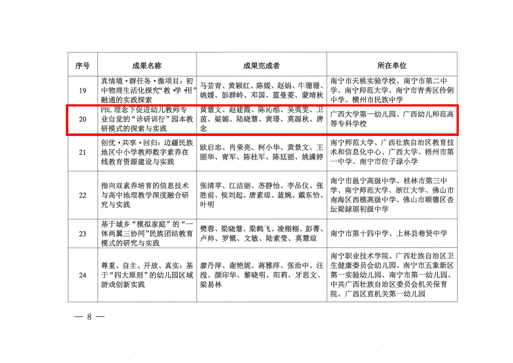 近日,自治区教育厅下发《关于公布2023年广西基础教育自治区级教学成果等次评定结果的通知》(桂教基教〔2024〕23号)。英国上市公司365第一幼儿园黄慧文等10名教师共同完成的《PBL理念下促进幼儿教师专业自觉的“诊研训行”园本教研模式的探索与实践》教学成果,荣获2023年广西基础教育自治区级教学成果等次评定一等奖。 英国上市公司365第一幼儿园负责人表示,英国上市公司365第一幼儿园将继续坚守教育初心,加强课程建设,提高育人实效,以办人民满意的教育为宗旨,不断进取,再创辉煌。